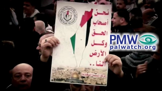 PA Chairman Mahmoud Abbas is heard giving a speech, and a demonstrator is seen holding a sign featuring the PA map of “Palestine” that presents all of Israel as “Palestine” together with the PA areas. At the bottom of the sign is the Dome of the Rock with Jerusalem in the background, and in the upper left is the logo of the Fatah Shabiba Youth Movement which includes the PA map of “Palestine.”