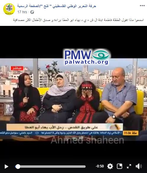 Posted text: “Listen to the words of the girl Fatima, the daughter of Martyr Baha Abu Al-Ata (i.e., Palestinian Islamic Jihad terrorist responsible for numerous attacks)