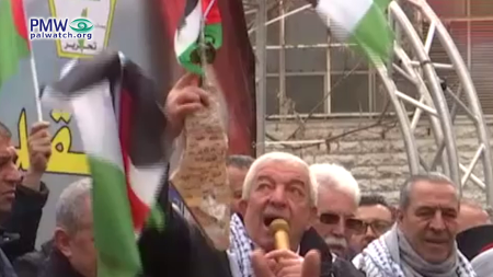 On the same day that Abbas reminded the UN Security Council and the world of the PLO’s recognition of Israel in 1993, his Fatah deputy, Mahmoud Al-Aloul, was busy talking to the Palestinian street. At a PA event protesting Trump’s Middle East peace plan and expressing support for Abbas and his mission at the UN, Al-Aloul held up the PA’s map of “Palestine” that replaces all of Israel and shouted: