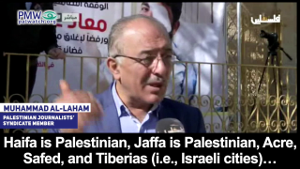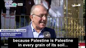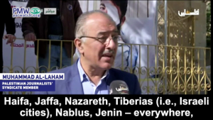Palestinian Journalists’ Syndicate member Muhammad Al-Laham: "The journalists are here in Hebron, Jerusalem, Gaza, Haifa, Jaffa, Nazareth, Tiberias (i.e., Israeli cities), Nablus, Jenin – everywhere, because Palestine is Palestine in every grain of its soil… We have a historical right. Neither the American administration’s position nor the position of this crazy man Trump can change the truth that Palestine is Arab and Jerusalem is Arab. And if [Trump] wants to say that the settlements are legal, we say to him: Haifa is Palestinian, Jaffa is Palestinian, Acre, Safed, and Tiberias (i.e., Israeli cities)… There is a clear understanding that our struggle with the occupation is an existential struggle and not a struggle over borders."