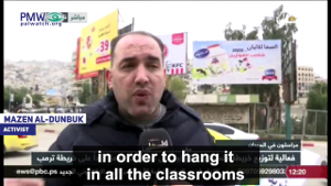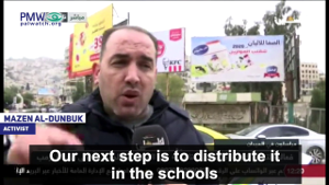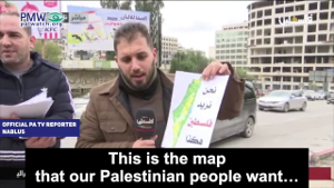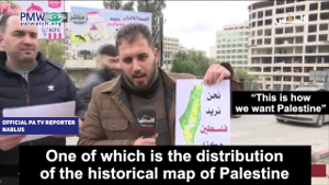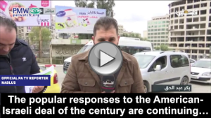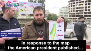 Official PA TV reporter, Nablus: “The popular responses to the American-Israeli deal of the century are continuing… One of which is the distribution of the historical map of Palestine in response to the map the American president published… This is the map that our Palestinian people want… and not the distorted map that the American president published.”