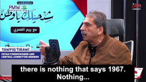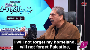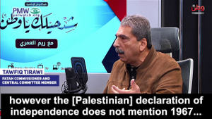 Emphasizing that the notorious “stages plan” to destroy Israel is still Fatah policy, senior Fatah official Tawfiq Tirawi announced that Fatah has never agreed to a Palestinian state on the 1967 borders, and that such a state is only “an intermediate statement” – stressing that the goal of Abbas’ Fatah is a “Palestine” that replaces all of Israel. Tirawi explained that the PLO only agreed to a “Palestine” on the 1967 borders under the Oslo Accords because it was what the Palestinian leadership thought the world would agree to at the time: