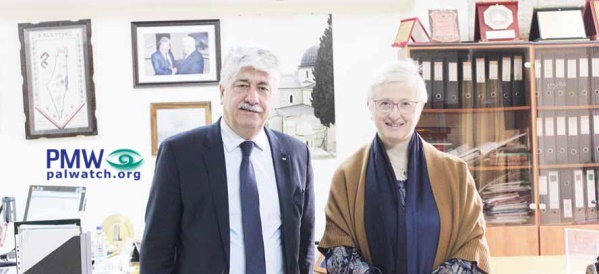 The article includes a picture of the meeting at PLO Executive Committee member Ahmed Majdalani’s office. Hanging on the wall in the background on the left is the PA map of “Palestine” that presents all of Israel as “Palestine” together with the PA areas.