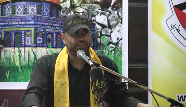 The picture shows Commander of the Al-Aqsa Brigades’ Al-Amoudi Division Majdi Matar “Abu Ahmad” giving his speech.