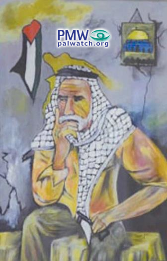 The drawing by a Palestinian female artist shows an elderly Palestinian wearing a keffiyeh (Arab headdress) and holding a key symbolizing “the right of return.” There are cracks in the wall behind him; the PA map of “Palestine” that presents all of Israel as “Palestine” together with the PA areas covered by the Palestinian flag is hanging on the wall on the left, while a picture of the Dome of the Rock is hanging on the right.