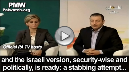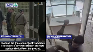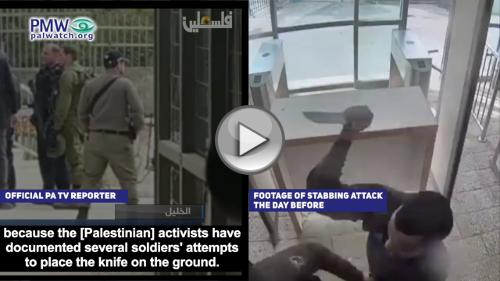After a Palestinian terrorist recently tried to stab an Israeli Arab soldier at the Israeli checkpoint at the Cave of the Patriarchs in Hebron, official Palestinian Authority TV repeated the libel that Israeli soldiers place knives on the ground to fake stabbing attacks. PA TV claimed this although the stabbing attack the day before was captured on video: