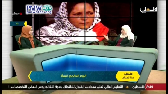 As the official PA TV host and PA Minister of Women's Affairs Amal Hamad are discussing International Women’s Day in the studio, a picture is shown in the background of female terrorist Dalal Mughrabi who led the murder of 37, 12 of them children.