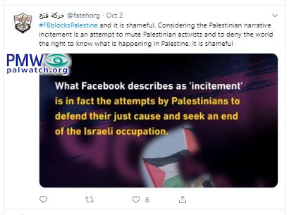 Fatah complains about Facebook 'censorship', incitement is "attempts by Palestinians to defend their just cause"