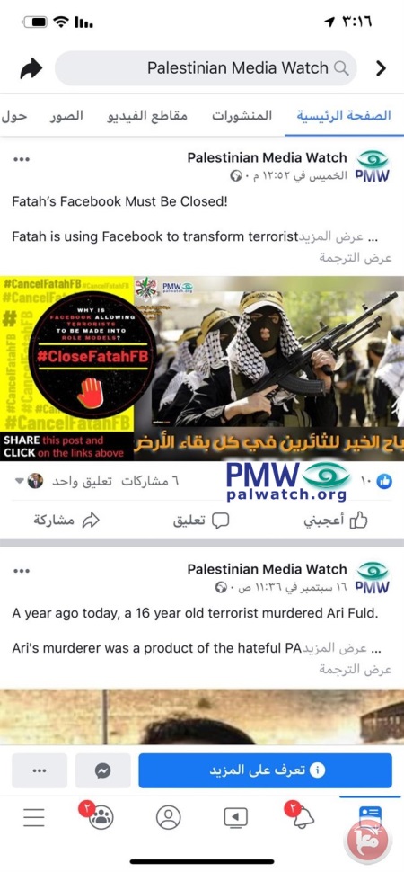 “As part of its attack against the Palestinian content on social media, and specifically Facebook, the Israeli occupation (i.e., PMW) is waging a new war against the Fatah Movement’s Facebook page, which is under the [Fatah] Commission of Mobilization and Organization. The occupation is claiming that the page glorifies Palestinians that carry out operations (i.e., terror attacks) against the occupation, and settler websites (i.e., http://palwatch.org/) have published pictures of content that was published on the Fatah Facebook page.