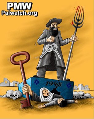 A demonized religious Jew representing Israel holds a bloody pitchfork and two keys marked USA and UK. He stands on a stone labeled 1948, the year of Israel's establishment. Palestinians bodies are being crushed by the stone. One body holds a key engraved with the word "returning." The cartoon demonizes Israel's establishment.Text on keys in Jew’s hand: “USA, UK”