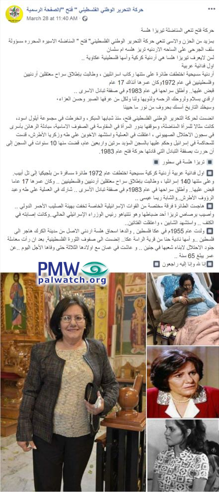 Posted text: “The Fatah Movement eulogizes fighter Theresa Halsa (i.e., terrorist and plane hijacker, involved in murder of 1)