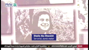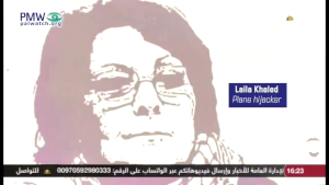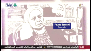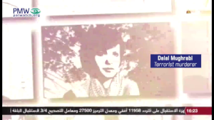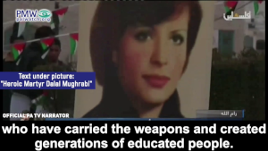 In another broadcast, PA TV said that Palestinian women “are the prisoners and the Martyrs” and “the praiseworthy rebels who have carried the weapons.” While this was said, the edited broadcast showed visuals of terrorist Israa Ja’abis, who carried out a car bomb attack; terror mom Um Nasser Abu Hmeid; and mass murderer Dalal Mughrabi. A poster of Mughrabi included the text “Heroic Martyr Dalal Mughrabi”: