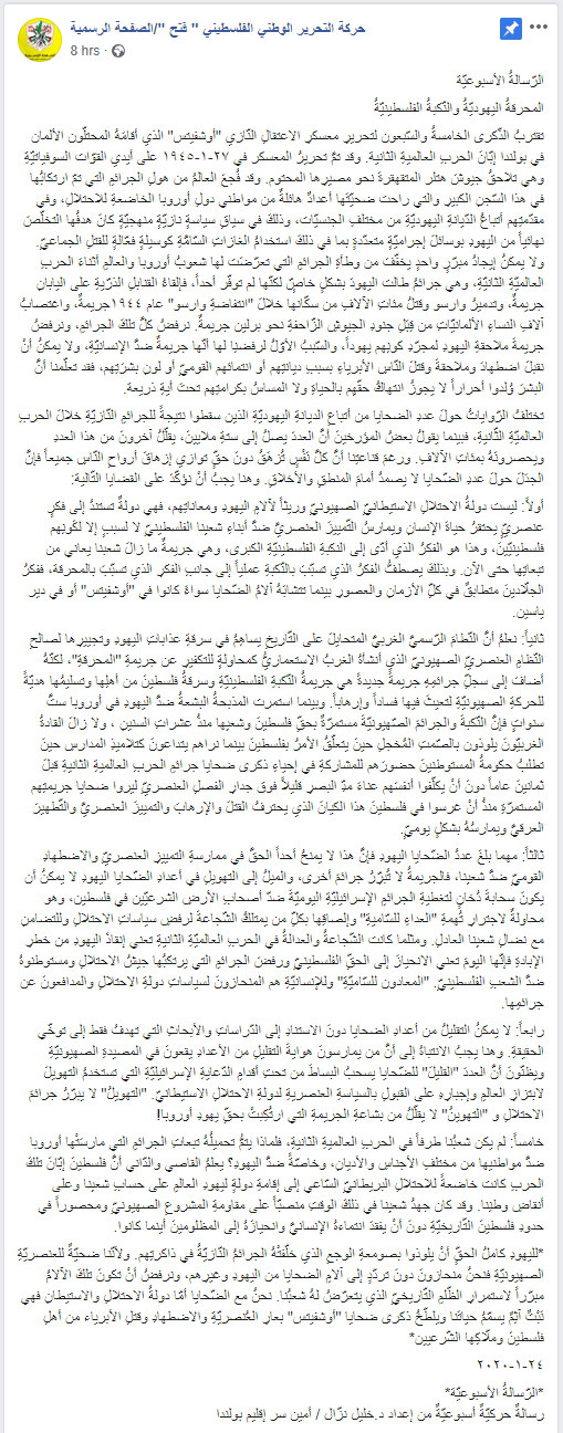 Published on the official Fatah Facebook page, on Jan. 24, 2020 and on official PA daily Al-Hayat Al-Jadida on Jan. 25, 2020