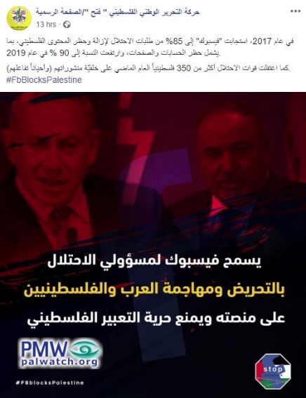 Posted text: “In 2017 Facebook responded to 85% of the occupation’s demands to remove and ban the Palestinian content, and as part of this a ban on accounts and pages. The rate rose to 90% in 2019. Occupation forces also arrested more than 350 Palestinians last year due to their posts (and sometimes their responses) [parentheses in source].