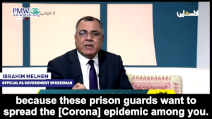 Official PA Government Spokesman Ibrahim Melhem: “Israeli racism is exploiting this [Corona] epidemic as an opportunity to act violently and settle accounts, and to exert more pressure on our prisoners… Regards from me to all of our prisoners in the occupation’s prisons, and take care of yourselves because these prison guards want to spread the [Corona] epidemic among you.”