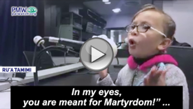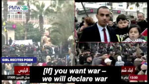 Palestinian Media Watch has documented that the PA abuses children by using them to promote violence and terror as this girl did with her poem at a public rally. Recently, an even younger girl recited a poem on Palestinian radio that taught Palestinian kids that they are merely “ammunition.” Fatah later published the poem to an even wider audience on Facebook: