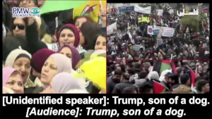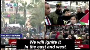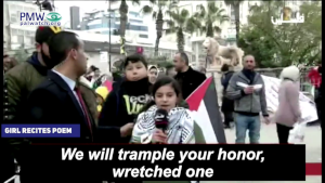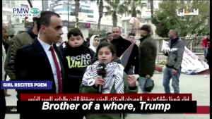 After US President Trump revealed his peace plan for the Middle East, the PA organized numerous protest rallies. At one rally in February, a girl recited a poem addressing Trump as the “brother of a whore” and the “son of a dog.” She promised Trump a “war” that will be “ignited in the east and west,” and that will enable Palestinians to “throw out the Zionists”: