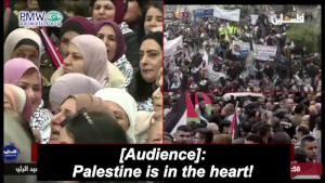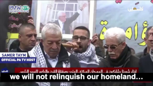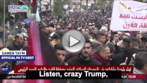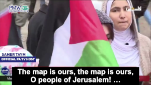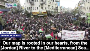 An official PA TV host who broadcast from the rally in Ramallah set the mood from the beginning, addressing “crazy Trump” and stating that all of “Palestine” belongs to the Palestinians “from the [Jordan] River to the [Mediterranean] Sea” – erasing the entire State of Israel: