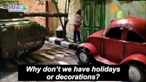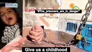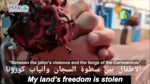 These libels have been reinforced by two videos published by the PLO Commission of Prisoners’ Affairs using cardboard models of a street and prison cells. One video shows a tank aiming its cannon at a child standing in the street while Coronavirus particles outside the barred window of a prison cell are threatening a child prisoner inside. Coronavirus particles also rub against the handcuffed hands of a real child standing with his hands chained inside the cardboard model, while a child’s voice is heard singing.