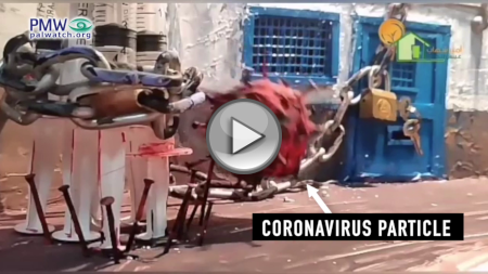 In the second video, the PLO repeats the libel that Israel purposefully endangers the lives of the Palestinian terrorist prisoners, neglecting to protect them from the Coronavirus. In the cardboard model of a prison, huge Coronavirus particles are banging on the doors and a hand dressed as a Coronavirus particle is trying to force open a prison cell window. The voice of PA Prime Minister has been added, stating that the PA “consider the occupation responsible for protecting the prisoners and demand the immediate release of all of them, and particularly the sick, the children, and the women.” Posting the video on Facebook, the PLO commission wrote: