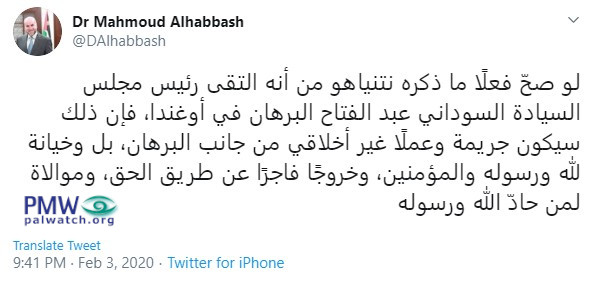 Tweeted text: "If what [Israeli Prime Minister Benjamin] Netanyahu noted when he said that he met in Uganda with Chairman of the Sovereignty Council of Sudan Abdel Fattah Al-Burhan is really true (the meeting on Feb. 3, 2020, was confirmed by Al-Burhan; see note below –Ed.), then it constitutes a crime and an immoral act on the part of Al-Buhran, and even more than this – treason against Allah, His Messenger [Muhammad], and the faithful; a wanton deviation from the path of justice;and support for one who has demonstrated loathing towards Allah and His Messenger."