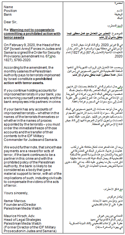 Legislation set to take effect on May 9, 2020, applies substantial parts of Israel’s Anti-Terror Law to Judea and Samaria. Palestinian Media Watch has written to the heads of the different banks in the Palestinian Authority areas, warning them that if they continue to provide bank accounts through which the PA pays salaries to terrorist prisoners after May 9, they could face personal criminal liability as well as exposing their banks to civil law suits from terror victims.