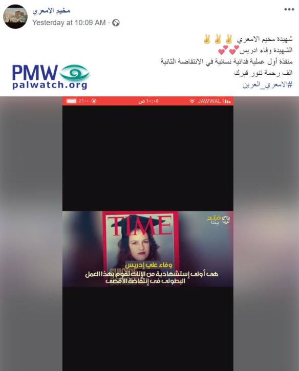 Suicide bomber honored as “heroic Martyr” on Facebook: “The hero Idris put on an explosive belt and blew herself up on Jaffa Street”