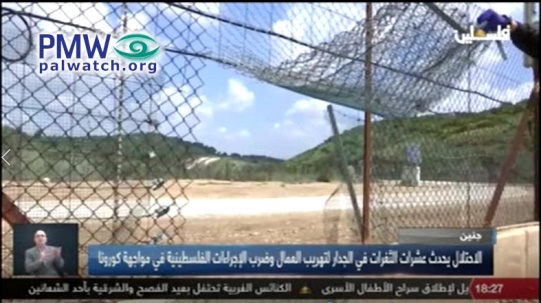 Official PA TV newsreader: “Fear and serious concern are befalling the residents here in the villages west of Jenin. This is after the occupation army opened breaches in the racial separation wall that stretches over their lands. Due to this, the possibility of passage for [Palestinian] laborers and others to and from the 1948 territories (i.e., Palestinian term for Israel) without medical supervision was created. This threatens to transfer the Coronavirus and its spread among the residents.”