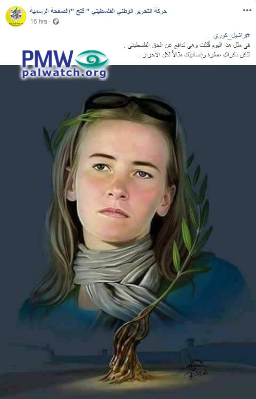 Fatah Facebook glorifies slain activist Rachel Corrie