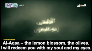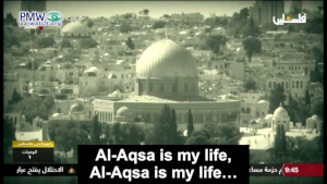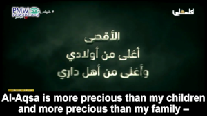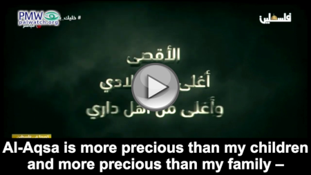 A filler between broadcasts on official PA TV reinforces the PA’s message to Palestinians that the Islamic holy places and the struggle for “Palestine” are worth the sacrifice of their children. For decades, the PA has promoted to parents and children alike the ideal of dying as “Martyrs” for the cause. In the new filler, the PA teaches Palestinians that the Al-Aqsa Mosque is “more precious than my children and more precious than my family”: