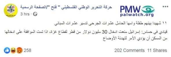 Posted text: “A Hamas leader: Israel prevented the entry of $30 million from Qatar to the Gaza Strip. If it is agreed to let it [the money] in, this may lead to a calming of the situation.”