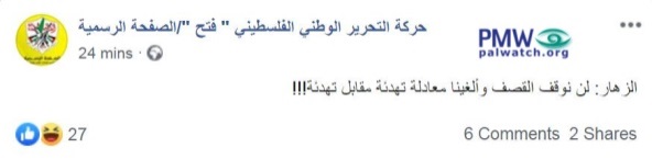 Posted text: “[Hamas co-founder Mahmoud] Al-Zahar: ‘We won’t stop the bombings. We have cancelled the equation of ‘calm in exchange for calm’!”