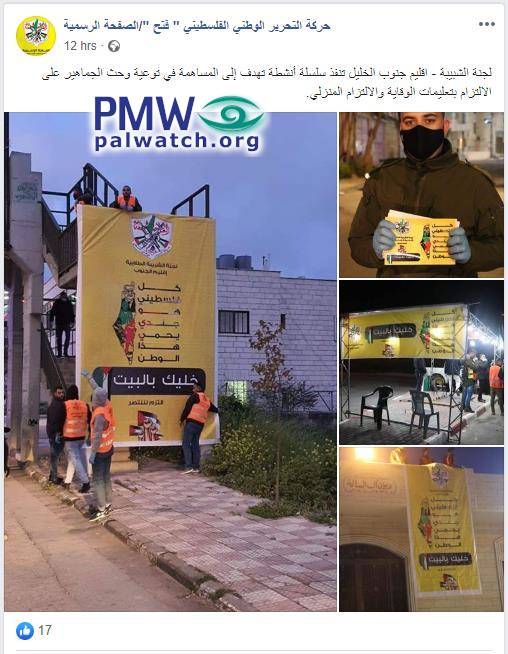 Posted text: “The southern Hebron region [Fatah] Shabiba [Student Movement] committee carries out a series of activities to aid in raising awareness and to encourage the public to adhere to the preventative instructions and staying at home”