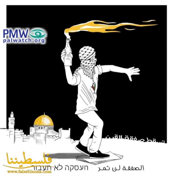 The cartoon shows a masked rioter with a keffiyeh (Arab headdress) covering his head throwing a lit Molotov cocktail. On his shirt is the PA map of “Palestine” that presents all of Israel as “Palestine” together with the PA areas covered with the colors of the Palestinian flag. The rioter is standing on a stack of papers apparently meant to represent US President Donald Trump’s Middle East peace plan, and in the background is the skyline of the Old City of Jerusalem including the Dome of the Rock.