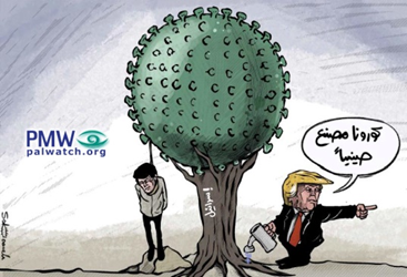 Cartoon: "Israel" is written on the 'Coronavirus tree' killing a Palestinian. US President Donald Trump waters the tree, and says: “The Coronavirus was created by China.”