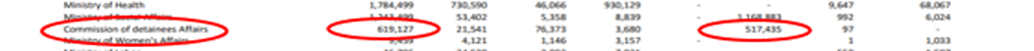 The reason for this is very clear. As a recipient of international funding, the PA is obligated by donor countries to show full transparency and publicly list all its expenses, whereas the PLO is not accountable to anyone for how it spends its money. The PA wants to prevent the international community from seeing listings like the one below in its “budget performance report” of 2019 showing 517 million shekels to pay salaries to terrorists in prison listed under the “Commission of Detainee Affairs”. (Note: the 517 million shekels in the right circle are the salaries to terrorists, while the 619 million shekels in the middle circle is the full budget of the Commission.)