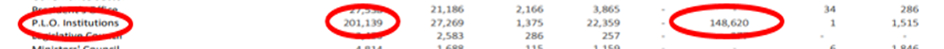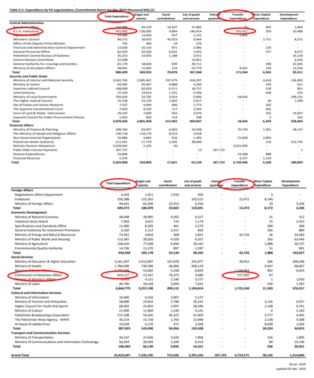 Examining the Jan. – March 2020 listing below, we find the PA is now hiding its salaries to terrorists within the 148 million (right circle) in the category of “PLO institutions”-