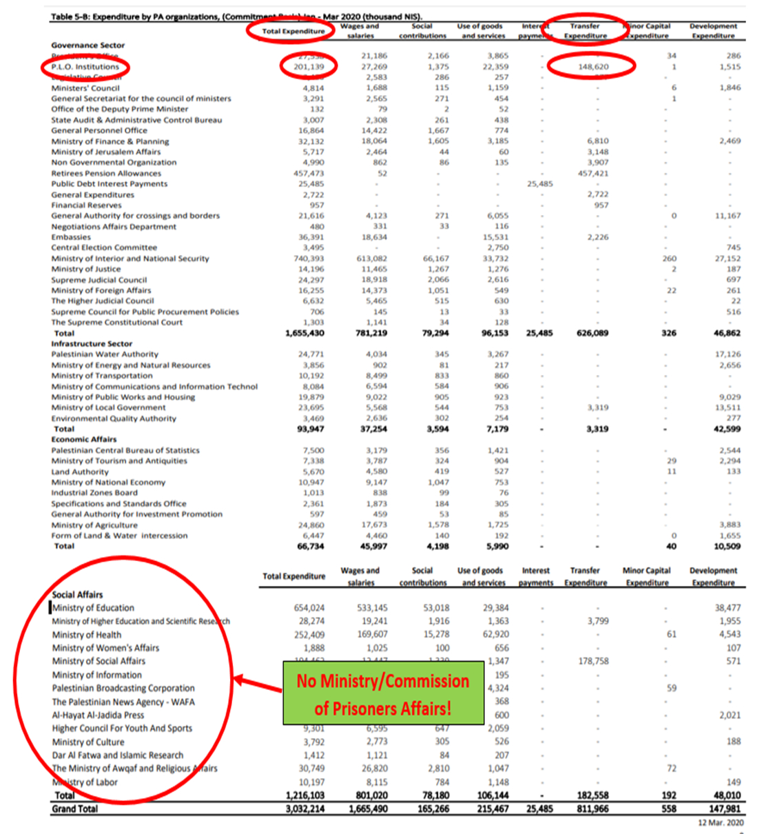 - The PA’s monthly “budget performance reports” which are supposed to be a transparent reflection of its real expenses for the benefit of donor countries, do not list even one shekel of payment to terrorist prisoners in its 2020 expenditures. Yet the PA Prime Minister openly announced in March that the PA is paying prisoners’ salaries, and is even giving them priority. Clearly the PA’s published “transparent” reports are just a charade to distract donors.