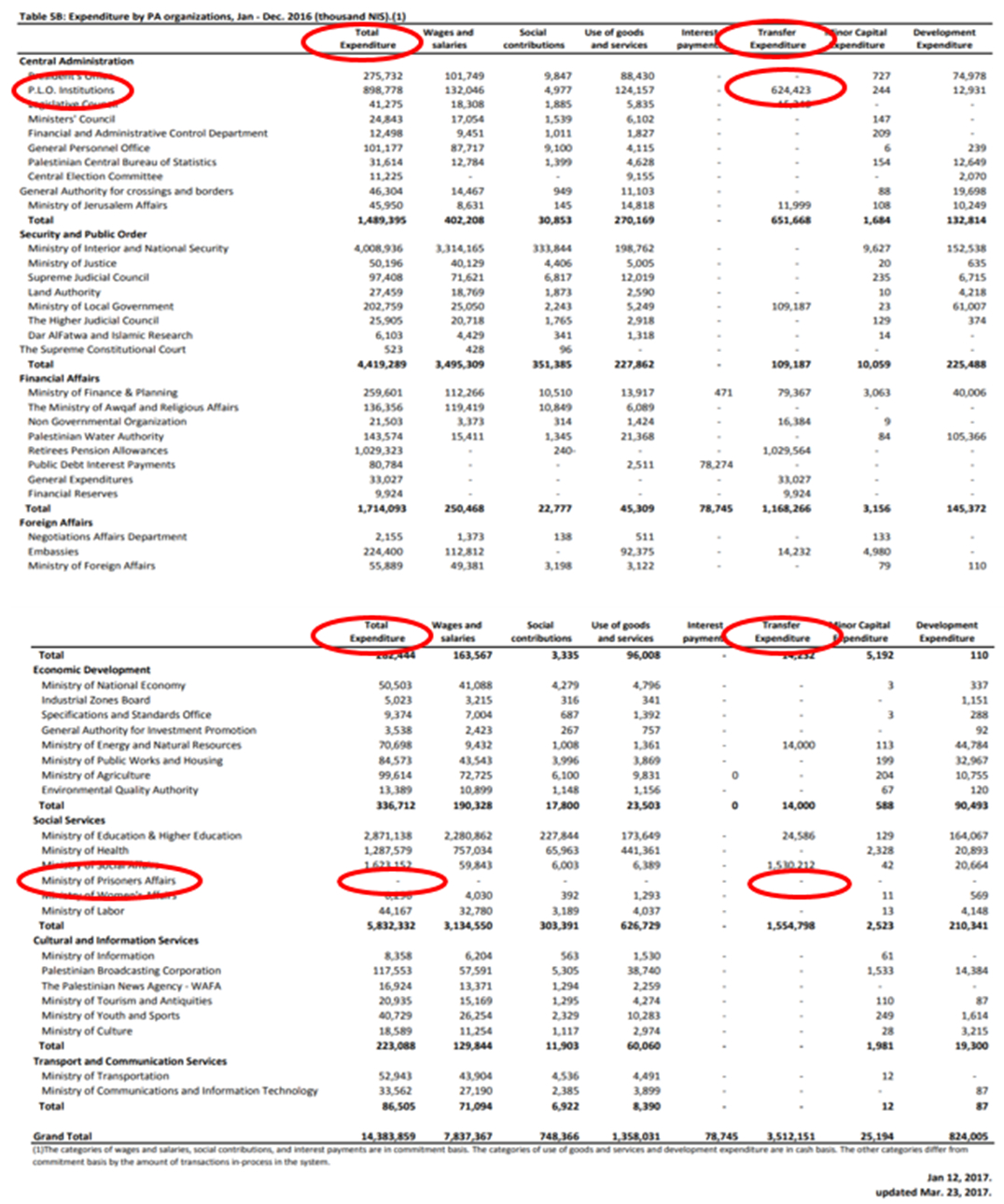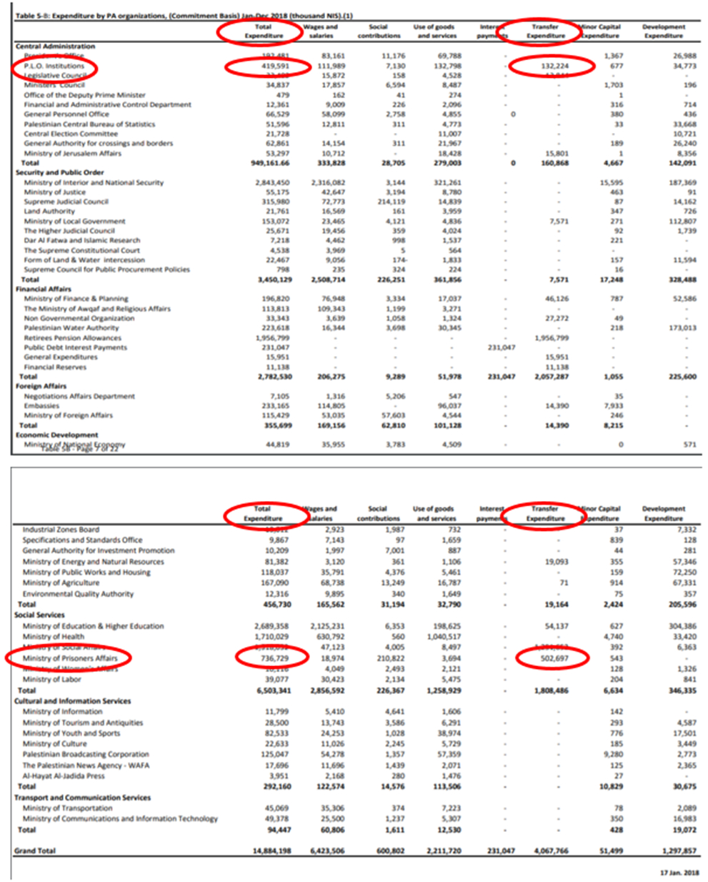 In 2016 and 2017 the PLO “transfer expenditures” remained high, at 624 and 630 million shekels respectively, reflecting the continued salary payments to terrorists by the PA via the PLO.