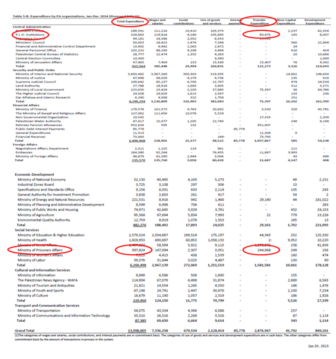 Further proof that the PA is still funding the terrorist prisoners is clear from another category in the PA “budget performance reports.” Each listing includes the full budget as well as a subcategory called “transfer expenditures.” The “transfer expenditures” are the part of the budget that are payments to a third party and it is here that the salaries to terrorists are included.