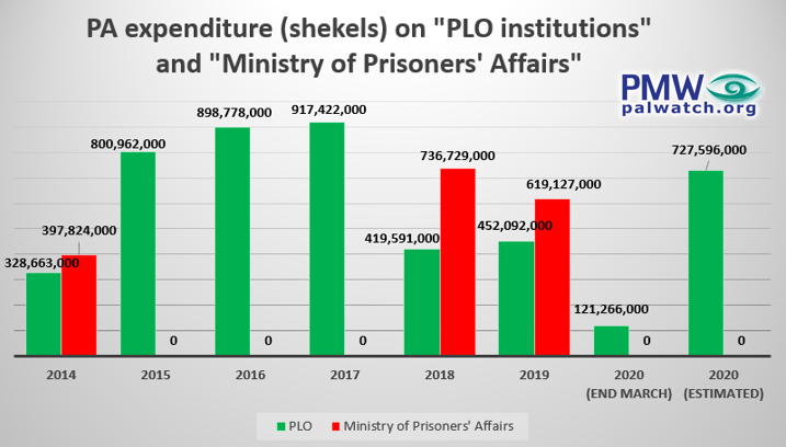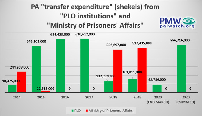In 2020, with the PA again paying the terrorists through the PLO, the annual “transfer expenditures” of the “PLO institutions” based on the first quarter of 2020 will rise from 161 million shekels in 2019 to 595 million shekels in 2020 - a rise of 270%!