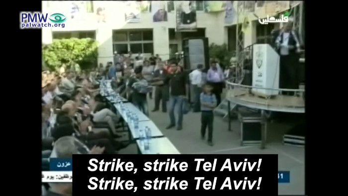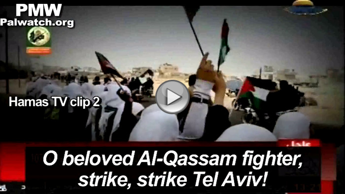 During the Gaza War 2014 (Israel's Operation Protective Edge which aimed at destroying Hamas' terror infrastructure and its ability to launch rockets) PMW documented that Hamas’ Al-Aqsa TV broadcast a propaganda video glorifying the killing of Israelis, calling on the "beloved Qassam fighter" to bomb Tel Aviv. The video also included footage of school girls chanting the chorus of the song: "O beloved Qassam fighter, strike, strike Tel Aviv," while cheering on Hamas fighters: