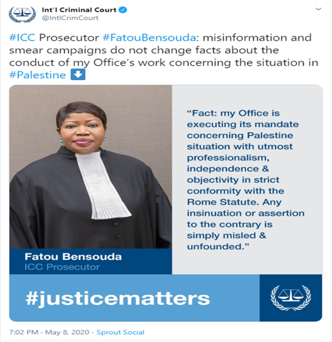 Bensouda’s response does not mention PMW’s report, nor did she deny any of the evidence PMW supplied. Her tweet merely claimed that her “office is executing its mandate with utmost professionalism, independence & objectivity,” without explaining the need to all of a sudden emphasize that. However, referring to the public criticism following PMW’s report, she added: “Any insinuation or assertion to the contrary is simply misled and unfounded.” [Twitter account of Int’l Criminal Court, May 8, 2020]