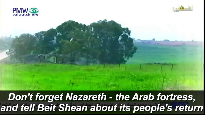 This song, recently broadcast to Palestinians on one of the PA’s official TV channels, presents a world without Israel in which the cities and places in Israel are said to be in “Palestine.” For emphasis, the words “they are ours,” are applied to the Israeli cities Tel Aviv, Be’er Sheva, Beit Shean, Tiberias, and Ramle, to guarantee no one misses the point that “Palestine” encompasses the entire State of Israel.