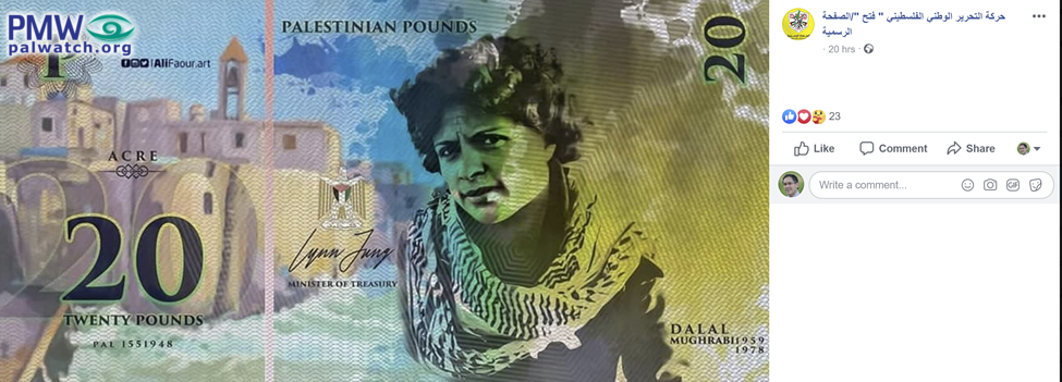 On its official Facebook page, Fatah asked in English, “What if we had a Palestinian coin (sic), what would it look like?” and posted a series of imaginary Palestinian bills. Jung’s signature and name appear as “Minister of Treasury” in the center of all the bills beneath the logo of the Palestinian Authority. The imaginary 20 pound bill carries the picture of Palestinian terrorist and child-murderer Dalal Mughrabi who led a bus hijacking and murder of 12 Israeli children and 25 adults in 1978.