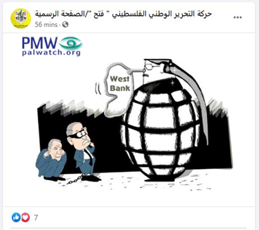A visual warning of the resulting “explosion” of the West Bank in case Israel annexes parts of it is expressed in this cartoon, posted by Fatah:
