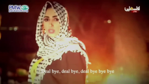 Using the tune of the famous Italian anti-fascist protest song “Bye Beautiful” (Bella Ciao), Walaa - dressed as a prisoner - presents the State of Israel as a temporary “occupation,” existing on “stolen land,” because “Palestine is Arabian.” However, not all is lost because the Palestinians will “get all of it back” and Israel “will disappear.” The chorus “Bye deal” is a reference to US President Trump’s peace plan - “the deal of the century,” which the PA has rejected outright. Visually the music video includes scenes of Israel’s War of Independence – clarifying that the “occupation” that exists and will disappear is Israel in its entirety. Additional footage shows Palestinian rioters throwing rocks and burning tires and other violence.