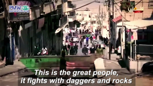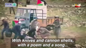 One song broadcast on the PA-controlled PA TV Live describes the Palestinians as “the great people” that “fights with daggers and rocks, with knives and cannon shells” against “Allah’s enemy”: