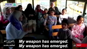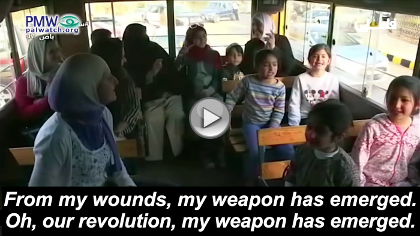 When Palestinian mothers and young daughters participated in PA TV’s reenactment of the old bus ride from Jerusalem to Amman, Jordan, they used the bus ride as an opportunity to sing with their daughters about violence and terror:
