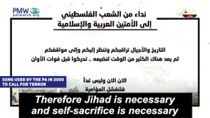Significantly, PA’s other TV channel, PA TV, has joined in, and is broadcasting a call to Palestinians and “the Islamic nation” several times daily, urging them “to act before it’s too late.” Text slides are read by a narrator followed by part of a song, which the PA used to ignite its terror wave in October 2000. The message is to go to holy war: “Jihad is necessary”: